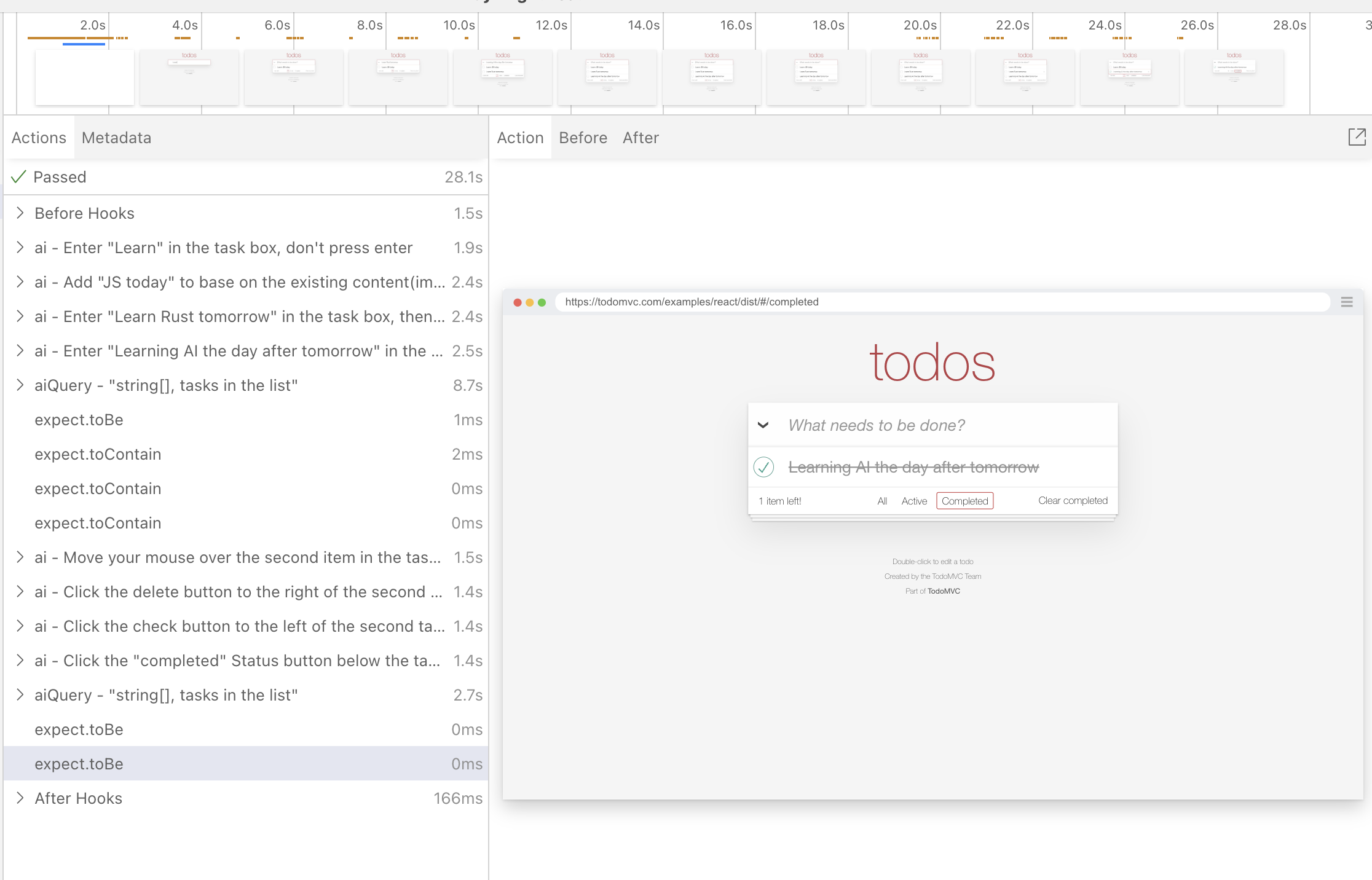• Playwright AI task report shows the overall time and aggregates AI tasks by test group